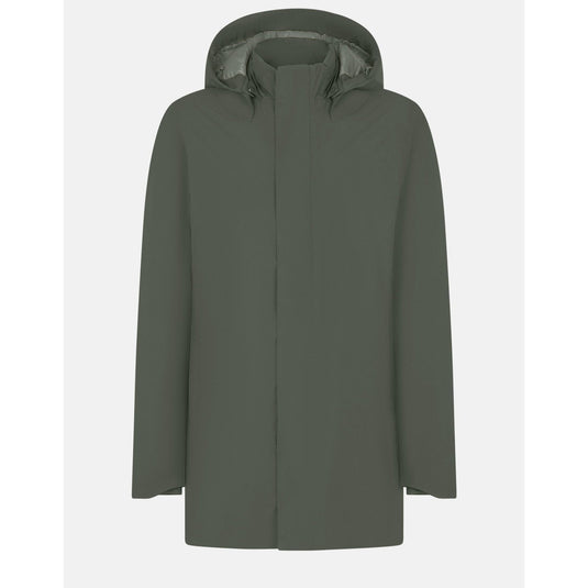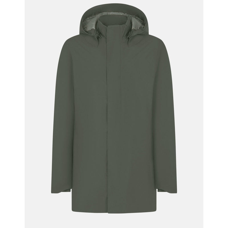 A coat with standing collar and detachable hood with buttons. The pockets are closed by zip and covered with a fixed shape, while the zip closure is a double slider with logo covered by flap and closed with soft touch velcro. The wrists have shaped edges and are finished inside by lycra gaiter. The garment has a PRO-TECH logo.